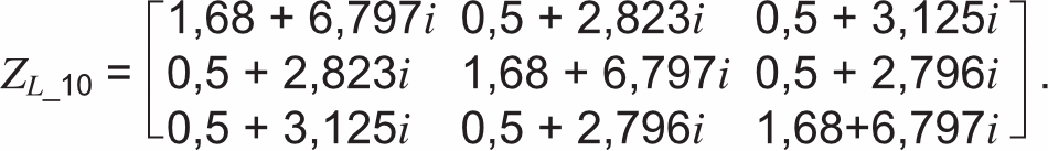 Для одноцепной ВЛ 220 кВ (с проводом марки АС-240/32, типом опор П-220–1, без грозозащитного троса) найдены матрицы продольных собственных и взаимно индуктивных сопротивлений для участка 10 км, Ом, [28]: