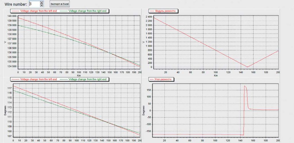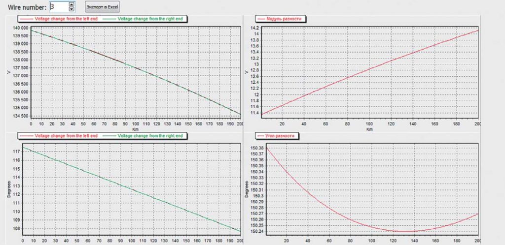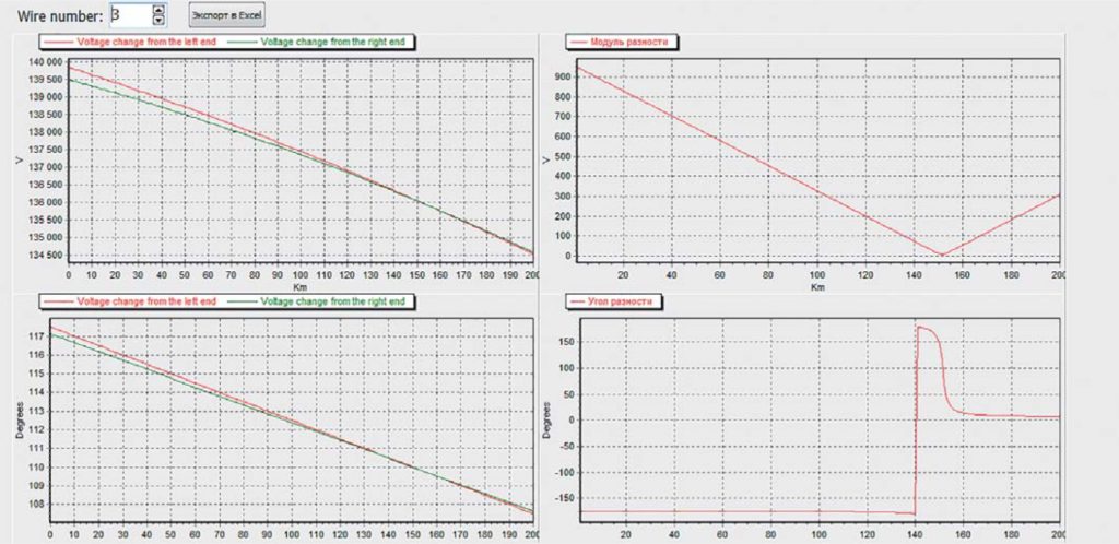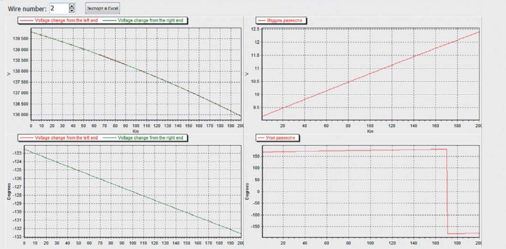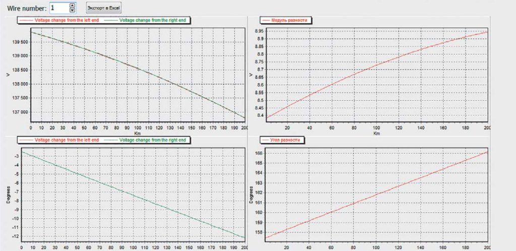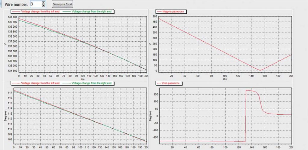 На рисунках 6–8 показаны результаты расчета в виде эпюр напряжений вдоль линии. На левом верхнем графике показаны эпюры модулей фазных напряжений вдоль линии с одного (красный цвет) и с другого (зеленый цвет) концов линии. Видно, что эпюры фазных напряжений с одного и с другого концов линии практически совпадают. Небольшое расхождение напряжений (график модуль разности, менее 0,1%) можно объяснить тем, что расчет на модели линии выполняется для участков по 10 км, а эпюры напряжений строятся для участков по 1 км. На левом нижнем графике показаны эпюры углов фазных напряжений. На правом верхнем графике показана разность модулей напряжений с одного и другого концов линии. На правом нижнем графике показана разность углов напряжений.