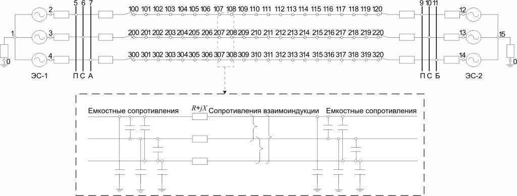 На рисунке 2 показана схема трехфазной линии длиной 200 км с двухсторонним питанием номинальным напряжением 220 кВ, подключенная концами к шинам подстанций (ПС А и ПС Б), которые связаны через сопротивления с питающими системами, заданными фазными ЭДС. Для обеспечения точности расчета режима модель линии разделена на 20 участков длиной 10 км.
