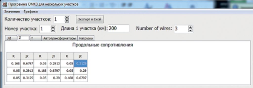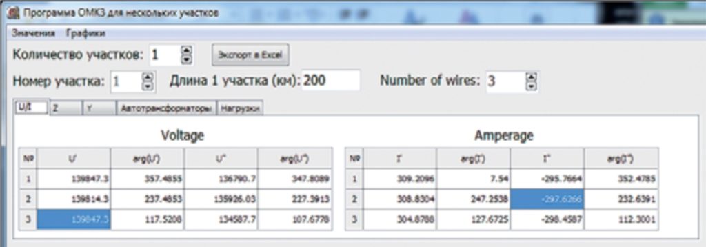 В программе ОМП заложен алгоритм определения токов и напряжений в конце каждого участка трехфазной линии по известным токам и напряжениям в начале участка и продольным и поперечным параметрам участка. Расчет проводится с одного и другого концов линии.