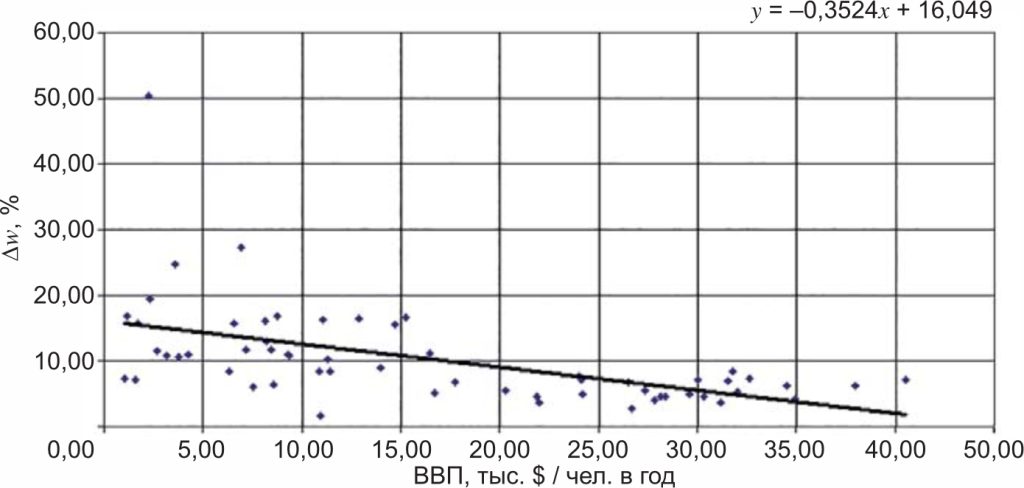 Сравнительный анализ относительных потерь в электрических сетях в европейских странах показывает, что имеется достаточно тесная связь этих потерь и уровня их экономик, в том числе ВВП на душу населения [5] (рисунок 1). В странах с более развитой экономикой, где относительные потери сравнительно ниже, как правило, выше техническая культура производства, передачи и распределения электроэнергии, используются современные системы управления режимами работы электрических сетей, контроля и учета электроэнергии, постоянно совершенствуются нормативно-правовая база, сис темы налогового и тарифного регулирования, стимулирования и взаимодействия с потребителями электроэнергии.