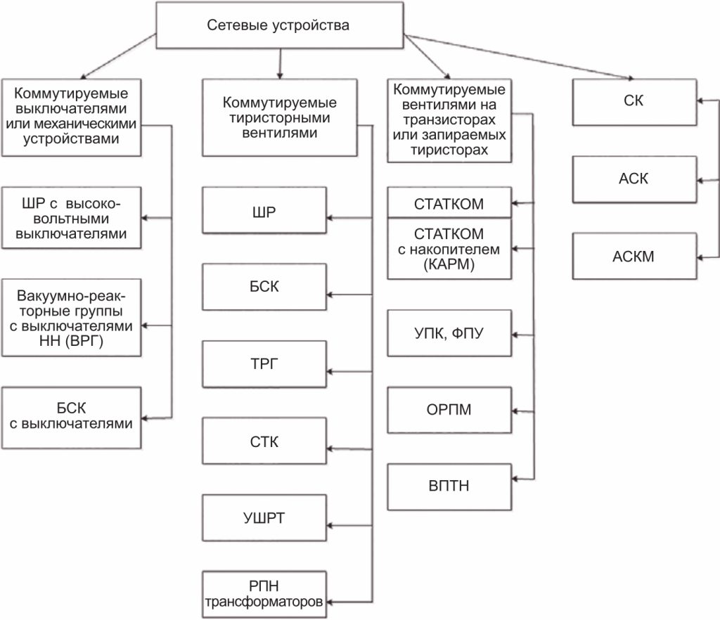 В СССР действовала аналогичная Шкала скидок и надбавок к тарифам на электроэнергию за КРМ [15], которая во время реформ электроэнергетики была отменена и сейчас отсутствует. В результате активность работ по компенсации реактивной мощности в России заметно снизилась, хотя отечественными промышленностью, бизнесом и научными организациями разработана и предлагается достаточно широкая линейка сетевых устройств, классификация которых представлена на рисунке 2 (ШР — шунтирующие реакторы, БСК — батареи статических конденсаторов, ФПУ — фазоповоротное устройство, ПК — продольная компенсация, УПК — управляемая продольная компенсация, ТРГ — тиристорнореакторная группа, СТАТКОМ — быстродействующий статический компенсатор, УШРТ — управляемый тиристорами шунтирующий реактор, ОРПМ — объединенный регулятор перетока мощности, ВПТН — вставка постоянного тока на основе преобразователя напряжения, СК — синхронный компенсатор, АСК — асинхронизированный компенсатор, АСКМ — АСК с маховиком на валу) [16].