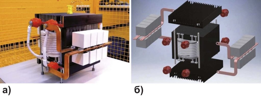В последние годы с развитием возобновляемых и распределенных источников электроэнергии и ростом их внедрения в распределительных сетях, особенно за рубежом, на смену классическим трансформаторам, конструкция которых не менялась на протяжении более века, приходят твердотельные силовые электронные трансформаторы (SST). Они представляют новое поколение преобразовательной техники, использующее силовые полупроводниковые элементы и системы управления, позволяющие реализовать функции, недоступные традиционным силовым трансформаторам. SST способны динамически адаптироваться к изменяющимся параметрам сети, компенсировать гармонические искажения напряжения, обеспечивать гальваническую развязку сетей разных номинальных напряжений, имеют компактные размеры и меньший вес (рисунок 3) [20]. Они могут напрямую взаимодействовать с цепями постоянного тока. Вместе с тем для них приходится разрабатывать специальные схемы защиты от импульсных перенапряжений от грозовых разрядов и коммутационных переключений.