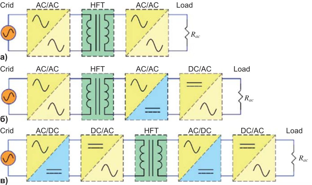 Различают три основных технологических варианта SST. Первый вариант представляет собой систему прямого преобразования переменного тока без промежуточного звена постоянного тока (рисунок 4а). Второй и третий, более распространенные, варианты предполагают двухступенчатое (рисунок 4б) и многоступенчатое (рисунок 4в) преобразование тока. Во втором варианте переменный ток на вторичной стороне трансформатора преобразуется в постоянный ток, а затем через инвертор — в переменный ток. В третьем варианте входные активный выпрямитель и инвертор преобразуют переменный ток в постоянный и постоянный в переменный ток, после чего на вторичной стороне трансформатора, так же как и на входе, осуществляется двойное преобразование тока из переменного в постоянный и обратно в переменный.