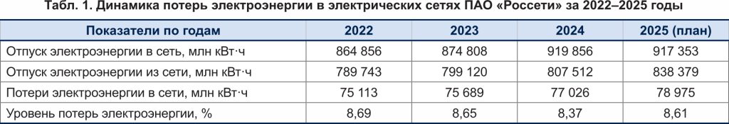 Динамика потерь электроэнергии в электрических сетях ПАО «Россети» за 2022–2025 годы представлена в таблице 1 [1]. Из таблицы следует, что относительные потери за этот период находятся практически на одном уровне с незначительной тенденцией к снижению.