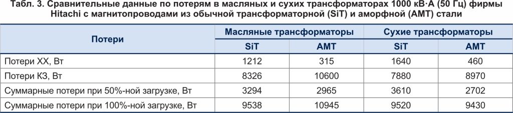 Энергоэффективные силовые распределительные трансформаторы. Все большее число зарубежных стран осуществляют замену физически изношенных и морально устаревших трансформаторов на новые с сердечниками из аморфных сплавов с уменьшенными в 3–4 раза потерями в стали (таблица 3) [17, 18].